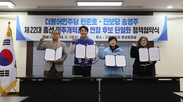 이미지 확대보기이날 정책협약식에는 한준호(민주) 후보, 송영주(진보) 후보, 강현수·송병일 고양비상시국회의 공동대표, 이도영 고양시민사회연대회의 의장, 최영희 진보당 고양시지역위원회 총선기획단장, 김재환 진보당 고양시지역위원회 부위원장 등이 참석했다.