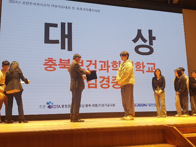 18일 충북보건과학대에 따르면 지난 16일 ‘2024년 충청권 치기공사 연합 학술대회 및 치과기과재 전시회’에서 열린 이 대회에서 치기공과 3학년 김경중 학생이 대상을 수상했다.
