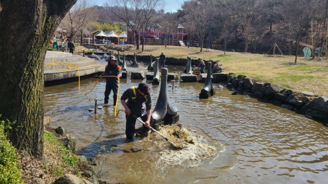 이미지 확대보기특히, 관광지 내 곳곳에 조성된 화단에 튤립, 팬지, 비올라 등 춘계 계절초화를 식재하는 등 방문객들에게 봄의 정취를 한껏 느낄 수 있도록 했다. 꽃샘추위가 채 가시기도 전인 3월 19일(화)에는 테마관광지의 개울, 연못에 시설사업소 근로자들이 직접 물에 들어가 묵은 찌꺼기를 내려보내 맑은 물이 흐르는 개울로 탈바꿈시켜 봄맞이 새단장을 마쳤다.