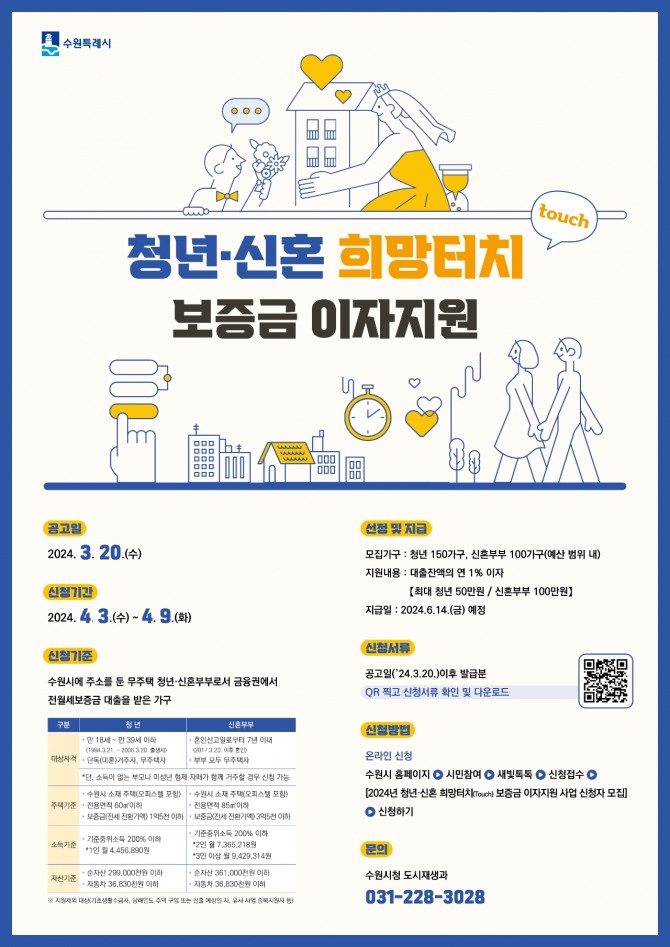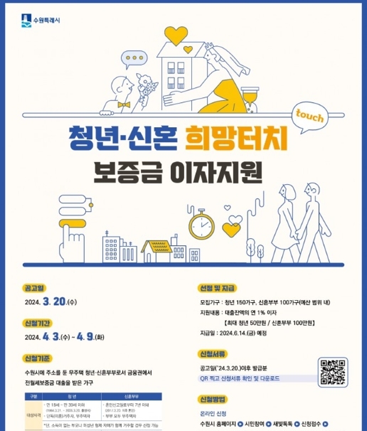 시 관계자는 “청년·신혼 희망터치 보증금 이자지원사업이 주거비 부담을 겪는 청년·신혼 가구에 도움이 되길 바란다”며 “앞으로도 청년층이 체감할 수 있는 주거복지 정책을 펼쳐 나가겠다”고 밝혔다.