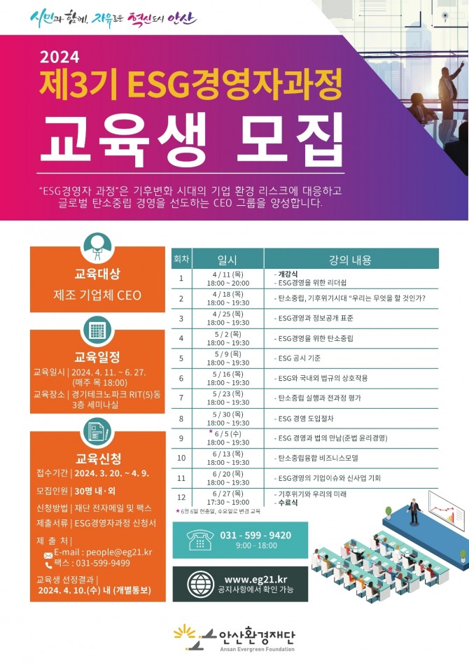 주요 교육 내용은 기후위기 극복방안의 하나인 탄소중립과 ESG 경영의 관계, ESG 경영의 세계적 추세와 비즈니스 모델, ESG 공시 기준과 도입 절차 등이다.