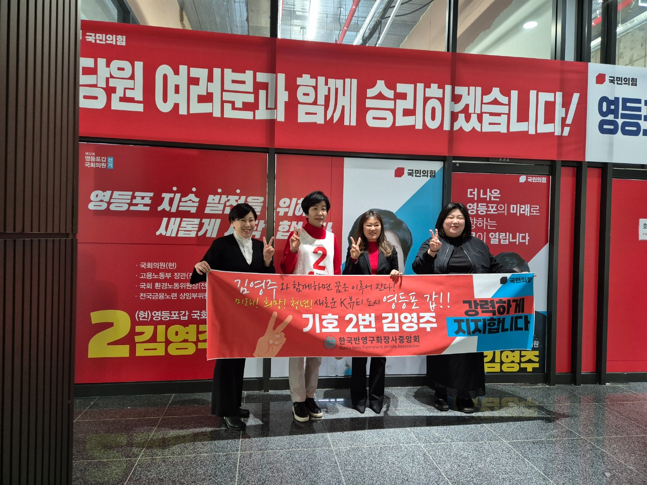이미지 확대보기한국반영구화장사중앙회는 1일 오후 김영주 후보 사무실을 방문해 소상공인들의 힘들고 어려운 점을 타개하고 개선 시켜 줄 인물로 김영주 후보만한 인물이 없다며 지지선언 이유를 밝혔다.