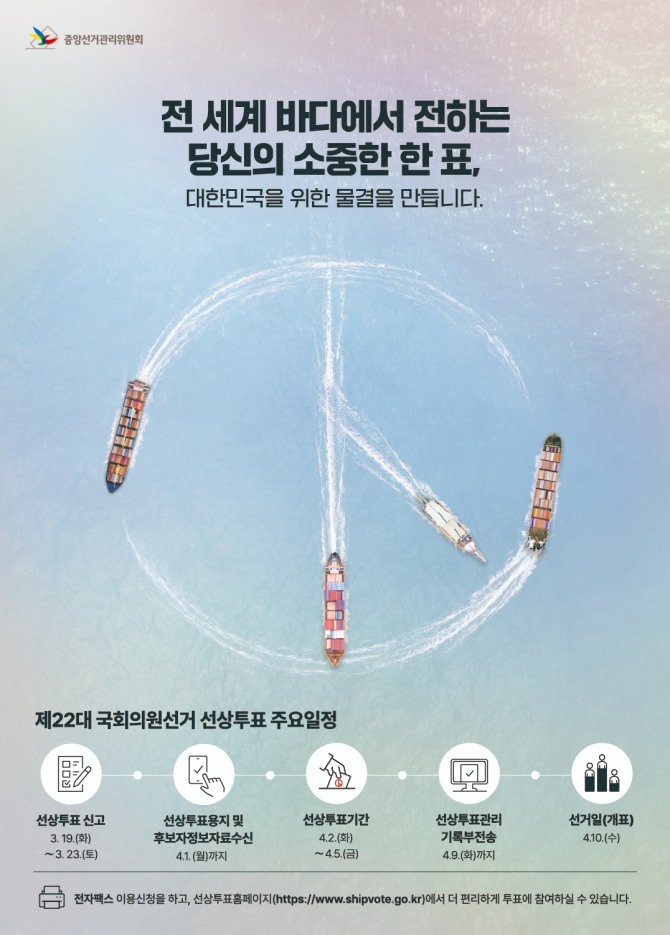 한편 선상투표신고를 했으나 선상투표개시일 전인 1일까지 국내에 도착한 선상투표자의 경우 선원수첩, 승무경력증명서 등 승선경력을 확인할 수 있는 서류를 첨부해 주민등록지 관할 구선관위에 신고하면 선거일인 10일에 주소지 관할 투표소에서 투표할 수 있다.