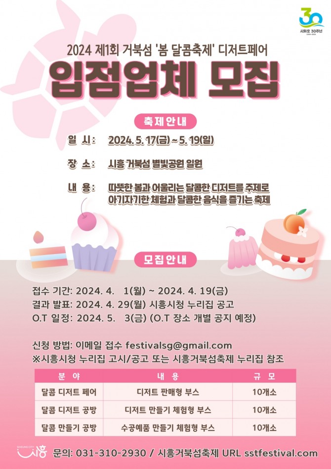 이에 따라 시는 디저트를 판매하는 ‘달콤 디저트 페어’와 디저트 만들기 체험부스인 ‘달콤 디저트 공방’, 수공예품 만들기 체험부스인 ‘달콤 만들기 공방’의 3개 분야에서 총 30개 업체를 선발할 계획이다.