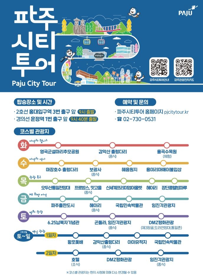 탑승지는 홍대입구역(3번 출구, 9시) 또는 운정역(1번 출구, 9시 40분)으로, 예약 등 관련 문의는 파주시티투어 누리집을 확인하거나 파주시티투어 고객센터로 문의하면 된다.