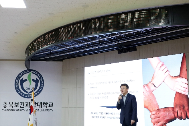 이어 2부 특강에서는 박용석 충북보건과학대 총장이 ‘CHSU 캠퍼스 라이프’를 주제로 학생들과 소통하는 자리를 가졌다.