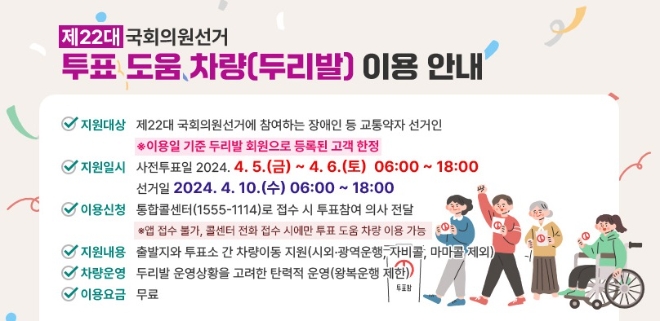 이미지 확대보기운행시간은 각 해당일 오전 6시~오후 6시까지, 투표소로 이동하는 장애인들에게 투표 도움 차량 '두리발'이 지원된다.