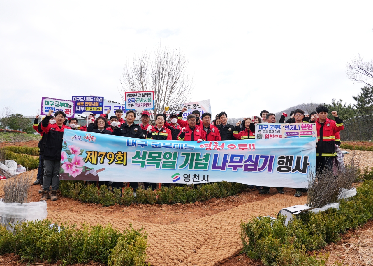 이미지 확대보기최기문 영천시장은 공무원 40여 명과 함께 이날 대구 군부대 유치를 기원하는 기념 식수와 함께 호국의 의미를 담은 무궁화 700여본을 식재했다.