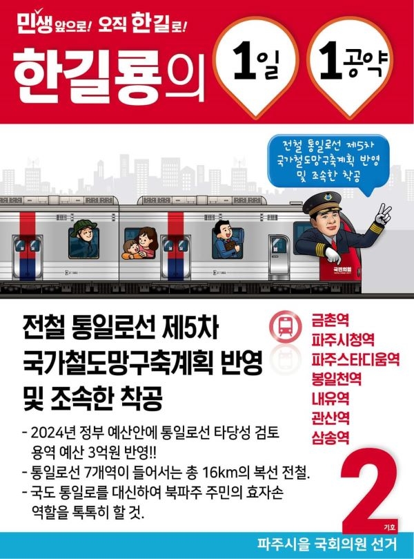 △KTX 문산역 연장=기존 문산차량기지 9만 7000만평을 통일로까지 확장·확충하면 총 20만평의 차량기지 확보로 KTX를 문산까지 연장 하고, 제5차 국가철도망구축계획에 반영해 조기 착공을 반드시 실현하겠다.