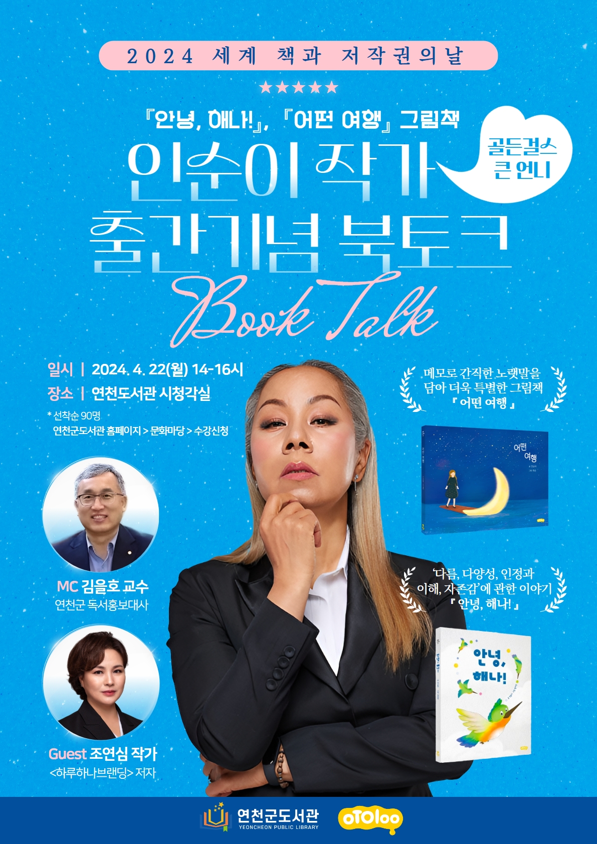 연천군은 오는 22일 오후 2시 연천도서관 시청각실에서 세계 책의 날을 기념하여 ‘인순이 작가 북토크’를 개최한다고 9일 밝혔다.영원한 국민 디바, 가수 인순이가 첫 그림책 '안녕, 해나'와 '어떤 여행'을 2024년 3월 출간하고 북토크를 연다. 작가 인순이는 가수로 살아오며 대중들에게 받은 사랑을 세상에 되돌려 주고 싶은 마음과, 독자 모두가 자신이 누구인지 찾고 스스로 좋아하는 일을 마음껏 해 나가길 바라는 마음을 담아 만든 그림책 이야기를 들려준다.
