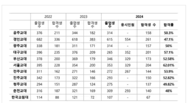 합격률을 교대별로 보면 전국 10개 교육대 중 서울교대가 62.01%로 가장 높았고, 그 다음으로는 △대구교대 57.10% △전주교대 53.9% △진주교대 52.82% △부산교대 52.58% △공주교대 50.3% △광주교대 50% 등이다.