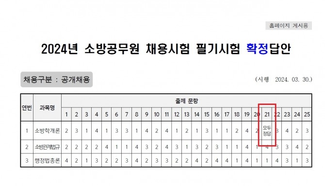 이미지 확대보기16일 소방청에 따르면 지난달 30일 소방공무원을 선발하는 공개·경력 채용시험이 진행됐다. 총 25개 문항 중 21번 문제가 논란이 됐다.