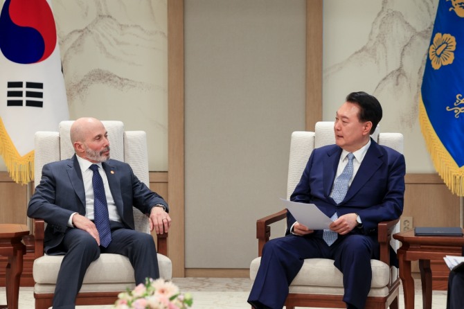 이미지 확대보기대통령실에 따르면 윤 대통령은 이날 대통령실 청사에서 그린버그 위원장을 접견했다. 윤 대통령은 “한미동맹의 지속적인 발전과 한미 간 경제협력 강화를 위해서는 양국 재계의 지지와 기여가 필수적”이라고 말했다.