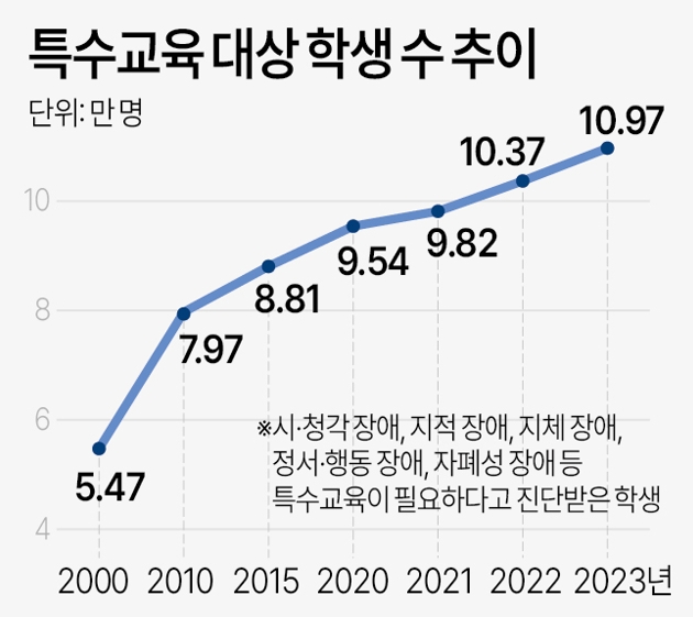 특수교육 대상 학생은 1990년 4만9936명으로 올라섰고, 이후 2022년 10만3695명으로 10만명대를 돌파했다. 이 기간동안 119.7%가 늘어난 것이다.