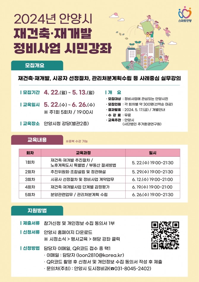 강좌는 안양시청 강당에서 매주 수요일 저녁 7시부터 9시 30분까지 총 5회차로 진행된다. 정비사업에 관심 있는 안양시민이면 누구나 신청해 무료로 수강할 수 있다.