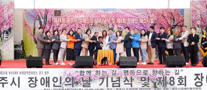 이미지 확대보기이날 행사는 ‘함께 하는 길, 평등으로 향하는 길’이라는 주제로 장애인과 비장애인이 함께 하는 소통의 장으로, 방세환 광주시장, 안태준 국회의원 당선인, 주임록 광주시의회 의장 및 시의원을 포함하여 관내 장애인, 자원봉사자 등 600여 명이 참석했다.