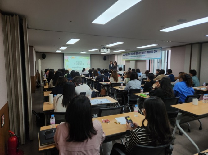이미지 확대보기이번 교육은 아이누리 돌봄기관 26곳과 지역아동센터 35곳의 70명의 종사자가 참여했으며, ‘역량 UP! 피로 DOWN!이라는 슬로건’으로 총 1, 2부에 걸쳐 진행됐다.