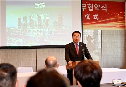 유정복 인천광역시장이 28일(현지시간) 중국 시안시에서 열린 '한중 문화·관광 교류협력 업무협약식'에서 축사를 하고 있다.사진=인천시