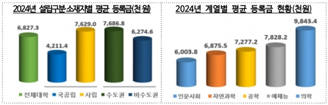 평균등록금을 설립 유형별로 살펴보면 사립대가 762만9000원, 국공립이 421만1400원이었다. 소재지별로는 수도권 768만6800원, 비수도권 627만4600원이었다.