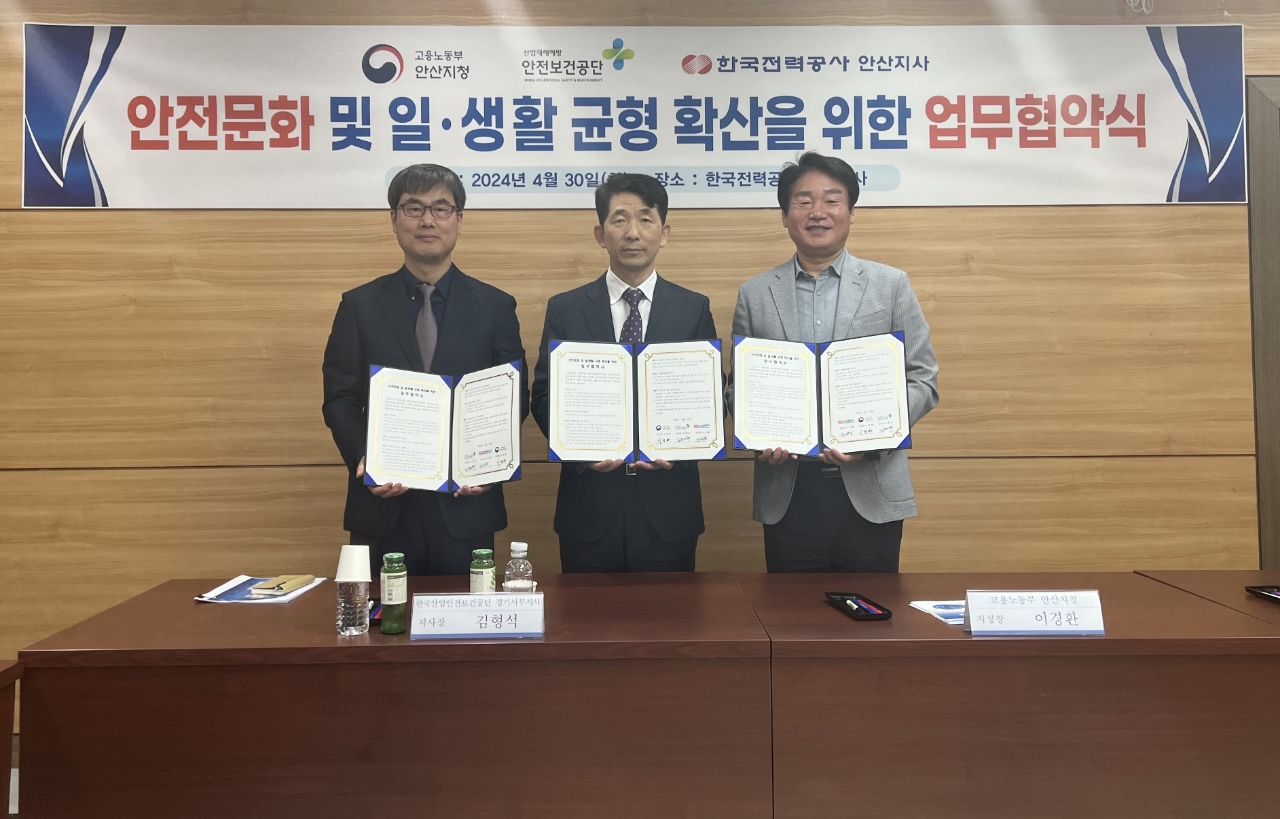 이미지 확대보기이번 업무협약은 지난 3월 22일 한국승강기안전공단 안산지사, 지난 4일 롯데건설과 업무협약에 이어 세 번째로 관내 전력사업 재해예방 및 일‧생활 균형 문화 확산을 위해 한국전력공사 안산지사, 산업안전보건공단 경기서부지사와 업무협약을 체결했다.