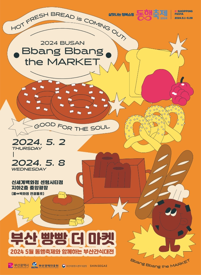 이미지 확대보기부산시는 2일부터 8일까지 7일간, 부산 해운대구 신세계백화점 센텀시티점 지하 2층 중앙광장의 백화점과 몰 연결통로에서 2024년 동행축제와 함께하는 부산간식대전 '부산빵빵더마켓'을 개최한다고 밝혔다.