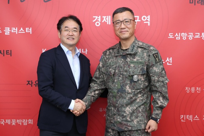 이미지 확대보기두 기관장은 서로 처음 만나는 자리에서 인사를 나누는 시간을 갖고, 이어 일산서구 대화동에 위치한 일산 예비군 훈련장 과학화 사업 처리 방안 및 향후 부대 이전 계획에 대한 상호 협력방안을 논의했다.