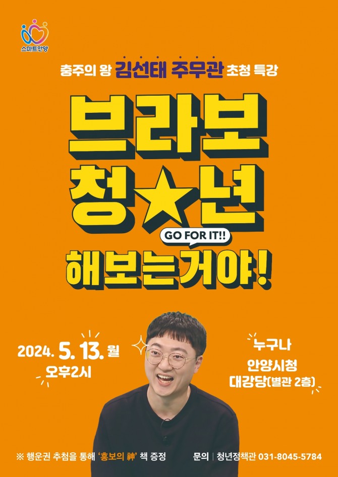 안양시가 일명 ‘충주맨’으로 유명한 충주시 김선태 주무관을 초청해 특강을 개최한다고 8일 밝혔다.특강은 오는 13일 오후 2시 안양시청 별관 2층 대강당에서 ‘브라보 청년 해보는거야!’라는 주제로, 시민과 공직자의 도전 정신을 일깨우고 창조적인 마음가짐에 대해 고민하는 계기를 마련하고자 진행한다. 참여는 별도 신청 없이 시민 누구나 참여할 수 있다.