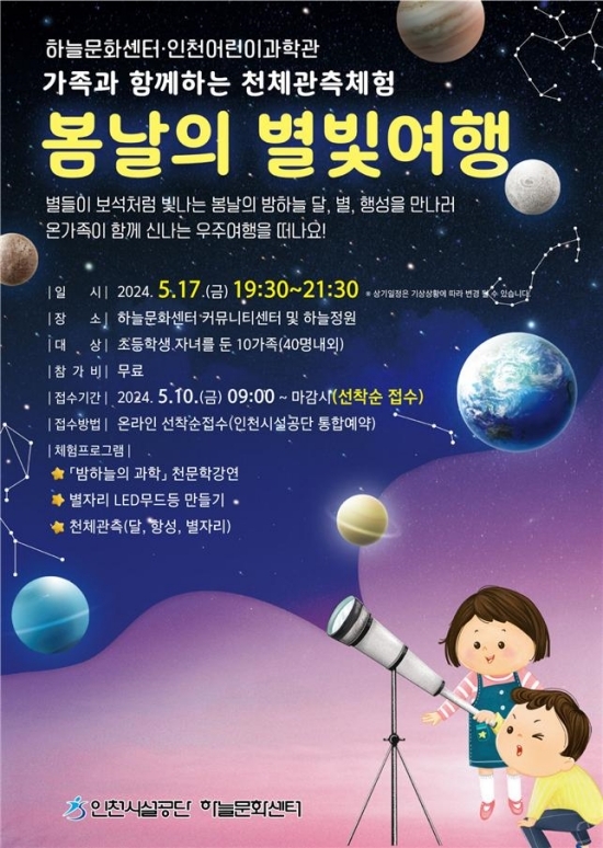 체험은 초등학생 자녀를 둔 가족 10팀을 대상으로 오는 17일 오후 7시 30분부터 9시 30분까지 무료로 운영될 예정이다. 접수는 오는 10일 오전 9시부터 인천시설공단 통합예약 홈페이지에서 선착순 신청이 가능하다.