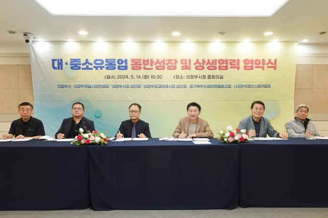 이미지 확대보기시는 14일 시청 중회의실에서 제일시장번영회, 의정부시장상인회, 청과야채시장상인회, 경기북부슈퍼마켓협동조합, (사)한국체인스토어와 ‘대‧중소유통업 동반성장 및 상생협력 협약’을 체결했다.
