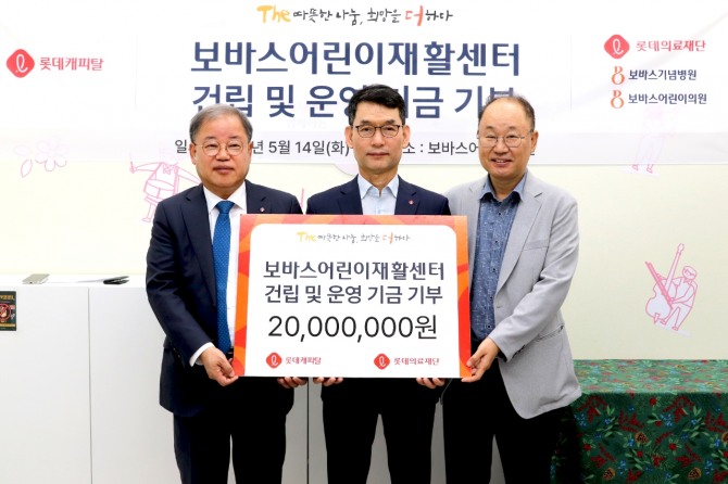 이미지 확대보기이번 기부금 전달식은 롯데캐피탈 추광식 대표이사와 정재경 경영전략 본부장, 롯데의료재단의 김천주 이사장, 보바스어린이의원의 윤연중 원장 등 주요 인사들이 참석했다.