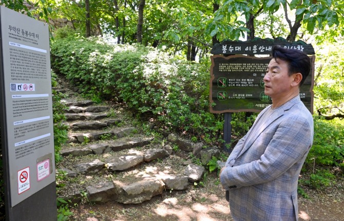 김동근 시장은 울창한 숲길 산책로를 걸으며 보행약자를 배려한 안전하고 편안한 데크길을 둘러봤다. 또 맨발 황톳길 중간중간 설치된 세족대와 황토 쉼터 등 시민 눈높이에 맞춘 시설들을 주의깊게 살펴봤다.