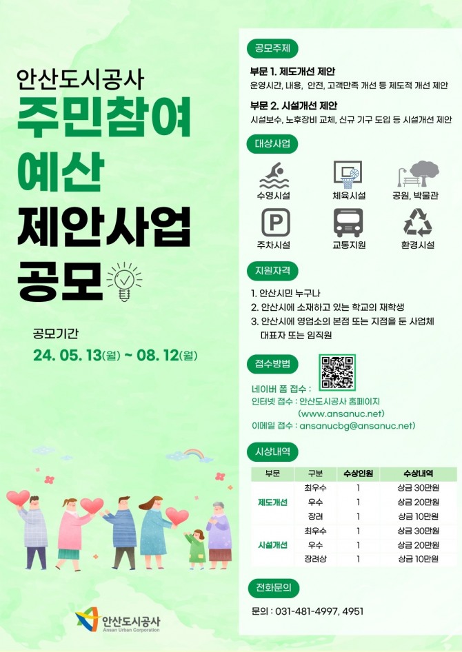 주민참여예산 공모 분야는 현재 안산도시공사가 운영하는 △수영시설 △체육시설 △공원·박물관 △주차시설 △교통지원 △환경시설을 대상으로 하며, 이에 대한 제도 및 시설개선 제안 2개 부문으로 이뤄진다.