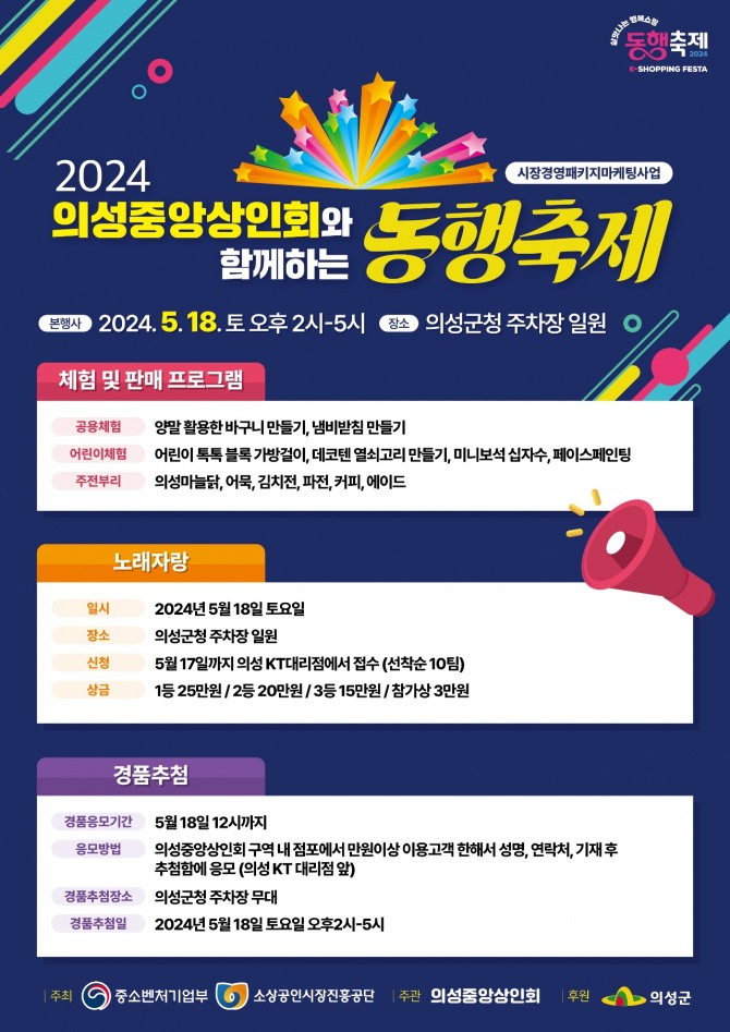 의성중앙상점가 일원에서는 17일부터 19일까지 게릴라 거리공연, 체험프로그램 행사 등이 개최되며, 특히 18일 오후에는 의성군청 주차장에서 고객 노래자랑 및 경품 추첨 행사 등이 있을 예정이다.