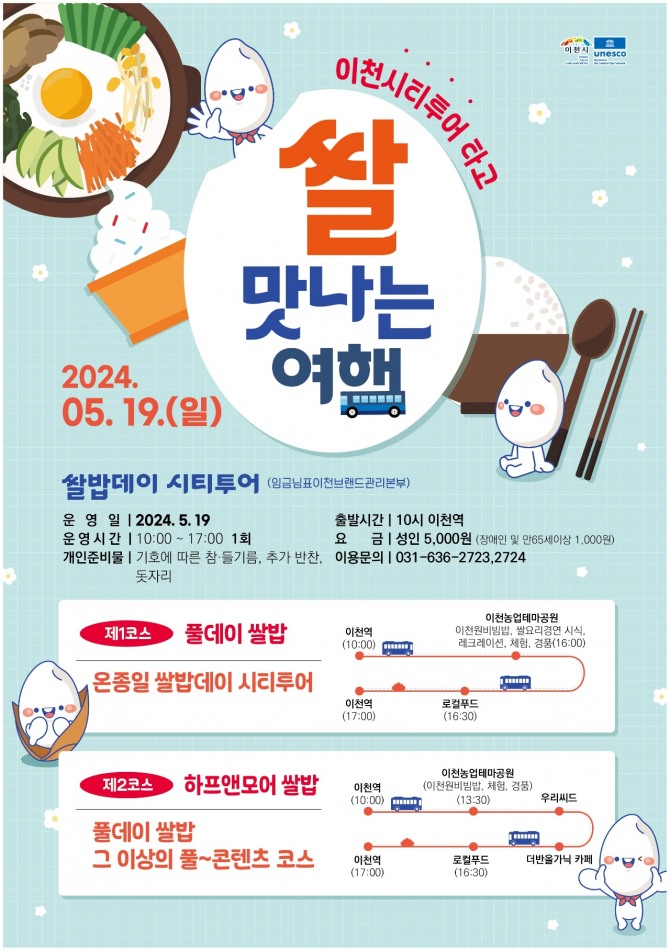 이번 ‘쌀 맛나는 여행’은 오는 19일 임금님표이천브랜드관리본부에서 개최하는 쌀밥데이를 테마로 풀데이쌀밥 코스, 하프앤모어 쌀밥 코스 두 가지 코스로 운영한다.