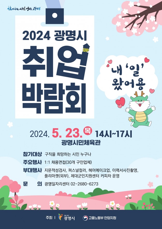 이미지 확대보기취업박람회는 기업체의 구인난을 해소하고 취업을 희망하는 구직자에게 취업 기회를 제공하는 행사로, 광명시와 금천구, 구로구 등 인근 지역에서 40여 기업체가 참여할 예정이다.