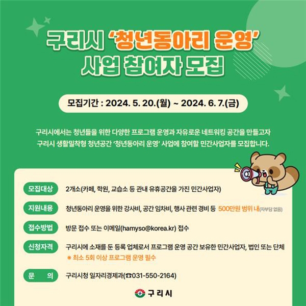 시는 청년동아리 운영을 위한 강사비, 공간 임차비, 재료비 등으로 500만 원 범위 내 지원할 예정이며, 자부담은 없다. 기타 자세한 사항은 구리시청 홈페이지 공고문을 참고하거나 일자리경제과 경제기획팀으로 문의하면 된다.