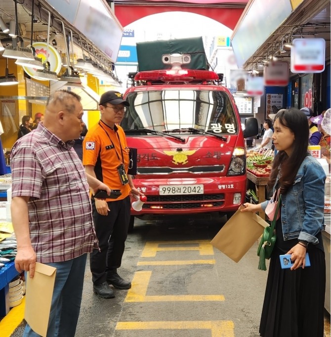 이미지 확대보기광명전통시장은 1970년대 초반부터 자생적으로 형성되어 현재 360여 개의 점포로 이루어진 전국 7위의 대규모 종합시장이다. 소규모 점포가 밀집해 있고 통행로가 좁은 전통시장 구조상 화재에 취약해 소방 통로 확보가 매우 중요하다.