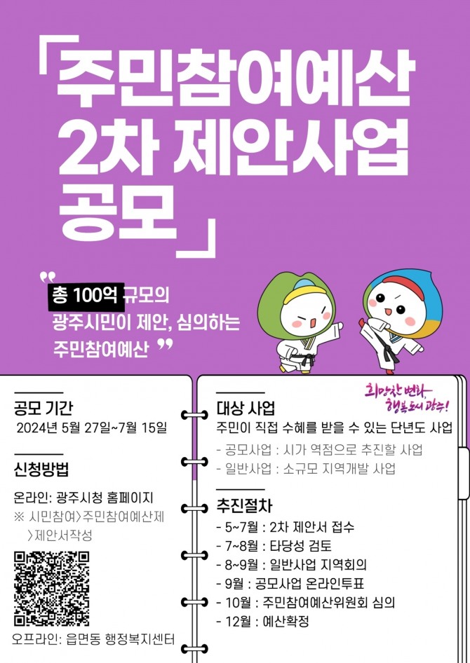 시는 광주시민이면 누구나 제안할 수 있으며 공모 기간 내 홈페이지를 통해 온라인으로 신청하거나 거주 읍면동 행정복지센터에 직접 방문해 신청할 수 있다.