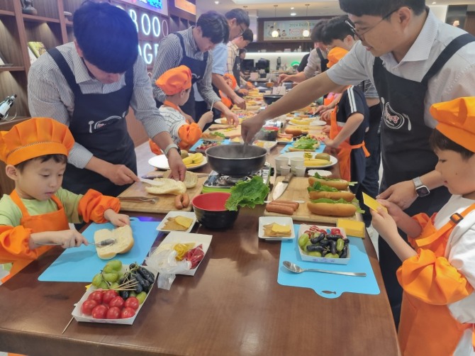 프로그램 대상은 5~7세 자녀를 둔 남성 직원으로, 이날 16명의 아빠와 아이들이 참가했다. 아빠와 자녀는 2인 1조로 전문 요리 강사의 설명에 따라 유부초밥, 핫도그 샌드위치, 과일꼬치로 구성돼 집에서도 손쉽게 만들 수 있는 ‘나들이 도시락’을 완성했다.