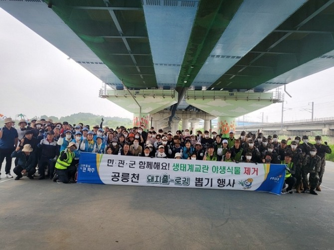 지난 4월부터 파주시는 이 일대 약 6000㎡ 가량의 초지를 생태계 교란 야생식물 제거 시범지역으로 설정하고 민관군 협력을 통한 집중 정화활동을 이어 나가고 있다.