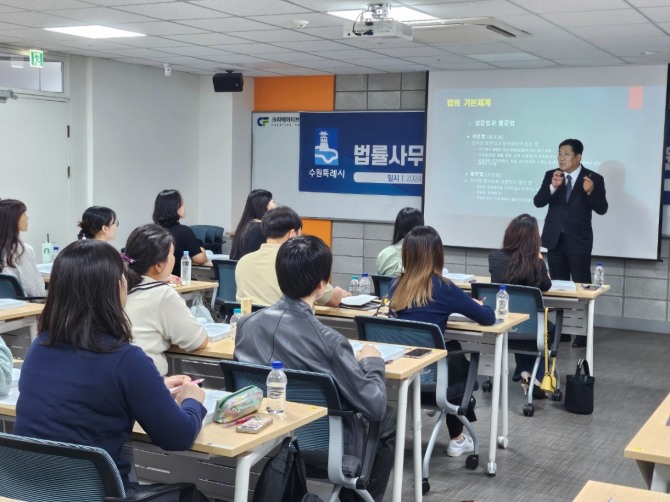 이미지 확대보기시가 아주대학교 로스쿨과 함께 진행하는 법률사무원 인력양성 지원사업은 수원시 구직 청년, 미취업 여성을 대상으로 법률 사무원 직무 전문교육을 하고, 수원시의 행정력과 아주대 로스쿨의 법률 인프라·네트워크를 활용해 맞춤형 취업을 지원하는 것이다. 올해는 25명이 오는 8월 20일까지 교육받는다.