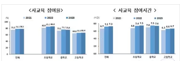 조사 결과 지난해 초·중·고생 사교육 참여율은 78.5%로 전년 대비 0.2% 포인트(p) 증가했다. 학교급별 사교육 참여율은 초등학생 86%, 중학생 75.4%, 고등학생 66.4% 순이다. 초등학생과 고등학생은 각각 전년 대비 0.8%p, 0.4%p 증가했으나 중학생은 0.8%p 감소했다.