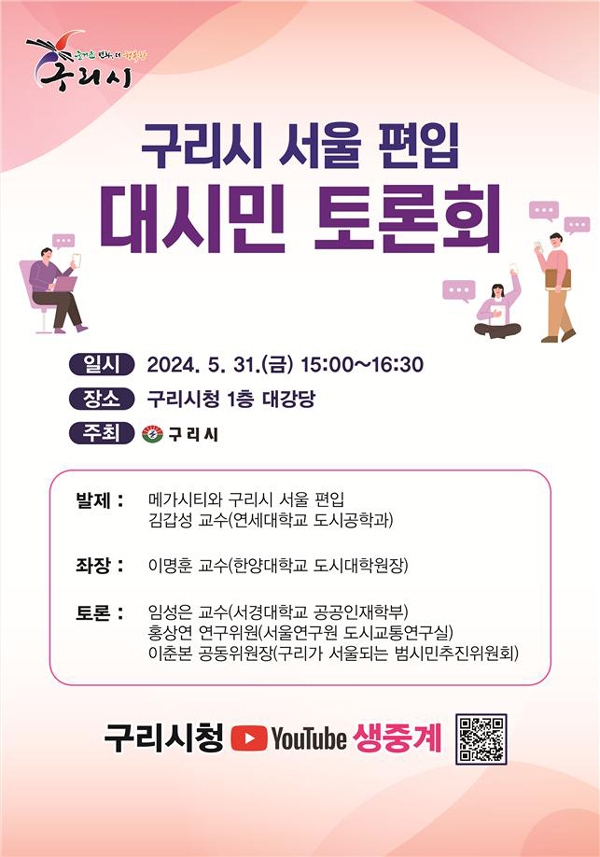 이미지 확대보기이번 토론회에서는 구리시의 서울 편입에 따라 예상되는 행정, 도시, 교통 등 각 분야별 이슈 및 해결 과제에 대해 이명훈 한양대학교 교수를 좌장으로 하고, 김갑성 연세대 교수의 발제를 시작으로, 임성은 서경대 교수와 홍상연 서울연구원 연구위원, 이춘본 구리가 서울되는 범시민추진위 공동위원장이 토론을 진행한다. 또한 많은 시민이 참여할 수 있도록 구리시청 유튜브를 통해 생중계로 진행될 예정이다.