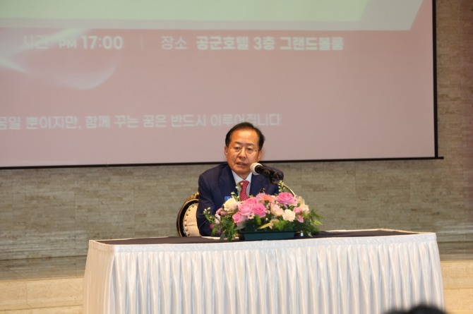 이미지 확대보기세미나에서 홍 시장은 ”지난 총선에서 왜 한이 없겠냐, 우리가 뽑고 만든 대통령은 우리가 보호해야 한다, 자승자박의 길로 가서는 안 된다”며, “우리가 뽑은 대통령을 곤경으로 몰아넣는 건 옳지 않다”고 말했다.