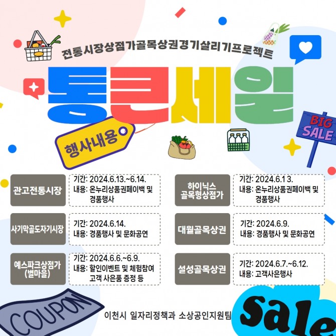 '2024년 경기 살리기 통큰세일' 사업은 지역상권의 위축된 소비심리를 개선하기 위하여 경기도시장상권진흥원에서 주관하는 행사형 공모사업으로, 이천시 관고전통시장 등 6개소는 지난 5월 최종 선정됐다.