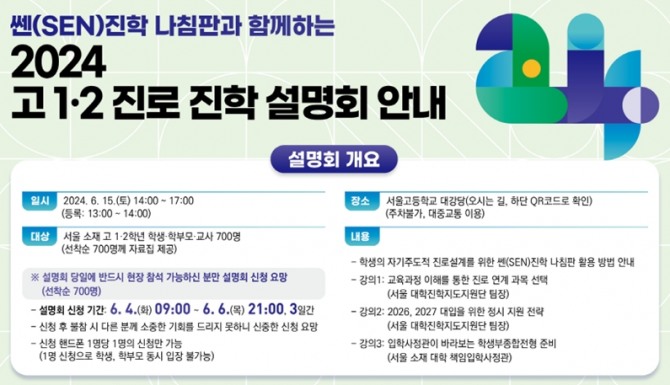 설명회에는 서울 소재 대학 책임입학사정관과 서울 대학진학지도지원단 팀장 등이 자리해 ‘쎈(SEN) 진학 나침반 활용 방법 안내’, ‘교육과정 이해를 통한 진로 연계과목 선택’, ‘2026·2027 대입을 위한 정시 지원 전략’, ‘입학사정관이 바라보는 학생부종합전형 준비’ 등을 주제로 강의를 진행한다.