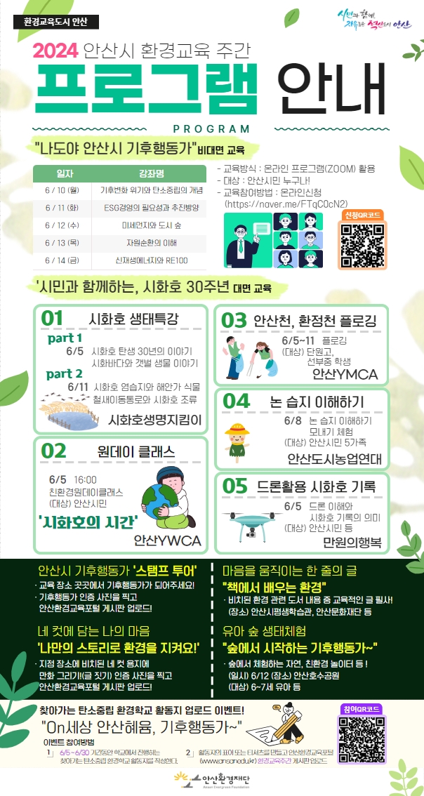 지난해 안산시 환경교육주간을 지정한 후 올해로 두 번째 열리는 본 행사는 시민 참여형 프로그램과 비대면 교육 프로그램도 준비되어 가능한 많은 시민들이 함께 참여하고 즐길 수 있도록 구성되었다는 평이다.