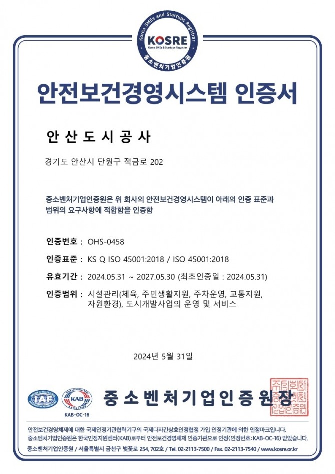 이미지 확대보기안산도시공사는 중소벤처기업인증원으로부터 국제표준화기구(ISO)가 제정한 ‘안전보건경영시스템(ISO45001)’ 인증을 획득했다고 3일 밝혔다.
