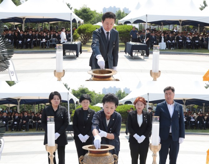 의원들은 이날 오전 10시부터 거행된 추념식의 식순에 따라 경건하게 묵념과 헌화 및 분향에 참여하면서 순국선열과 호국영령의 고귀한 희생을 추념했다.