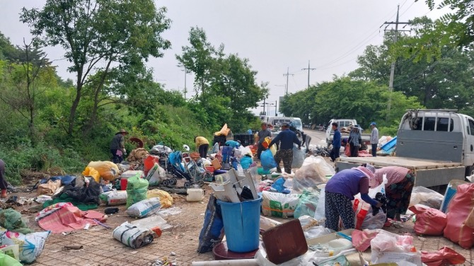 각종 쓰레기 종류별 분류가 되지 않아 강화군 청소과에서는 수거를 하지 않고 있어 도시미관을 해치고 있었던 집합장소에 봉소리 이정재 이장의 솔선수범이 돼 주민들이 차량 등 지원으로 4시간 걸쳐 깔끔하게 청소를 했다.
